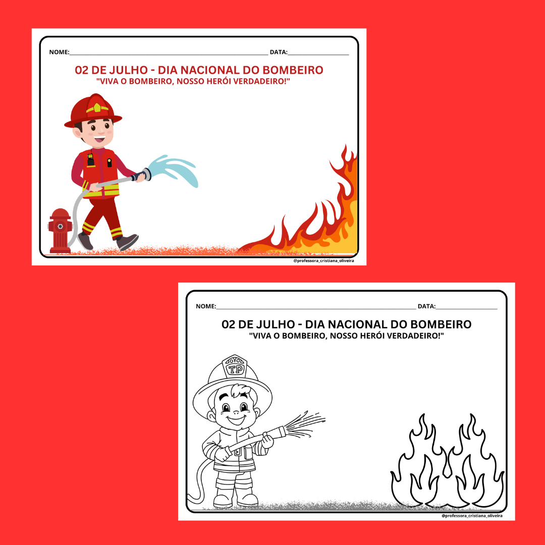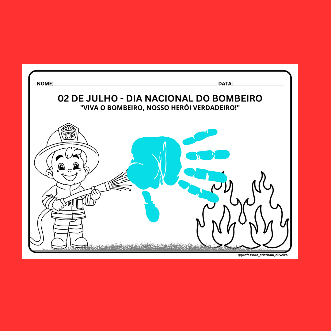 As crianças receberão uma folha com o desenho de um bombeiro segurando uma mangueira, de onde estará saindo um “espaço em branco” indicando a água. A proposta é que cada criança use a palma da mão pintada com tinta azul para carimbar, representando a água sendo jogada para apagar o fogo.
